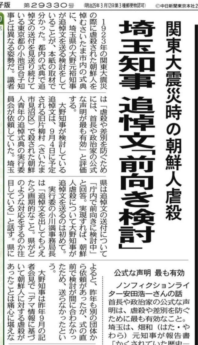 本日の東京新聞一面に、今から101年前の関東大震災の際に虐殺された朝鮮人悼むさいたま市内の式典に、大野元裕知事が追悼文を送る検討をしているとの記事が掲載された。