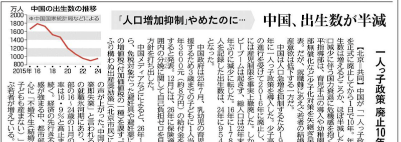 本日の東京新聞朝刊に、中国の出生数が10年で半減したとの記事が掲載されていた。