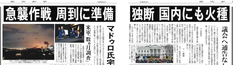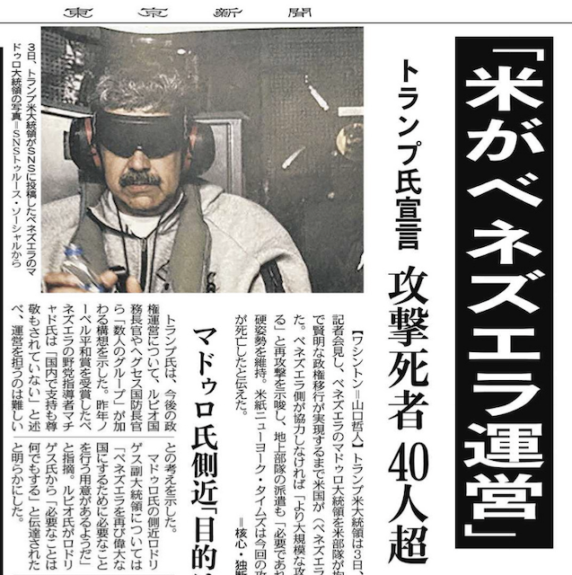 本日の東京新聞朝刊に、ベネズエラマドゥロ大統領を国内から連れ去り、米国が
