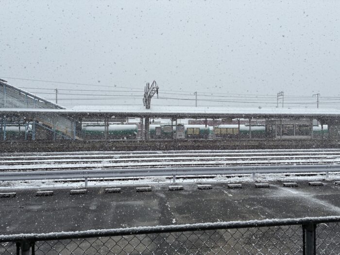 雪が舞う四日市駅